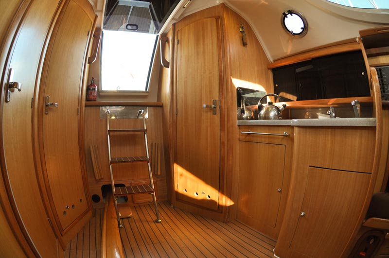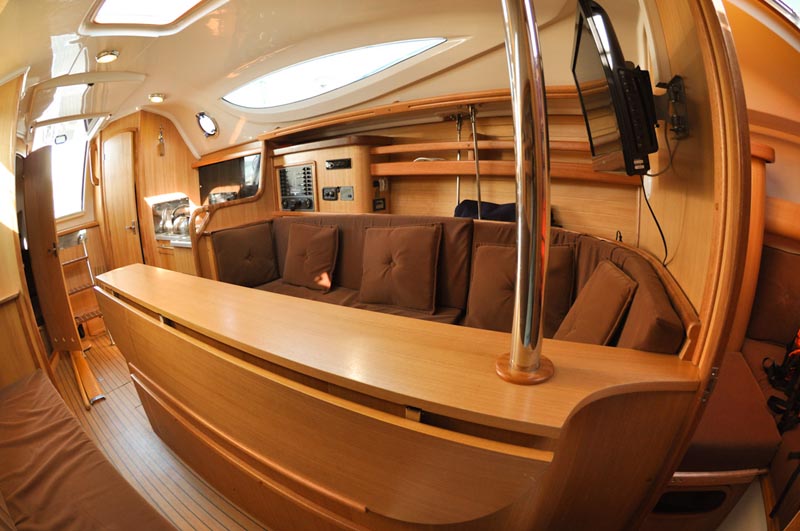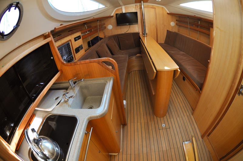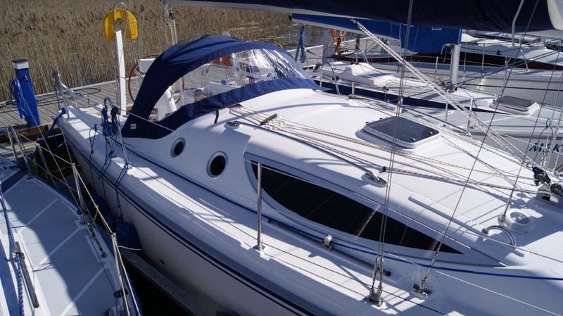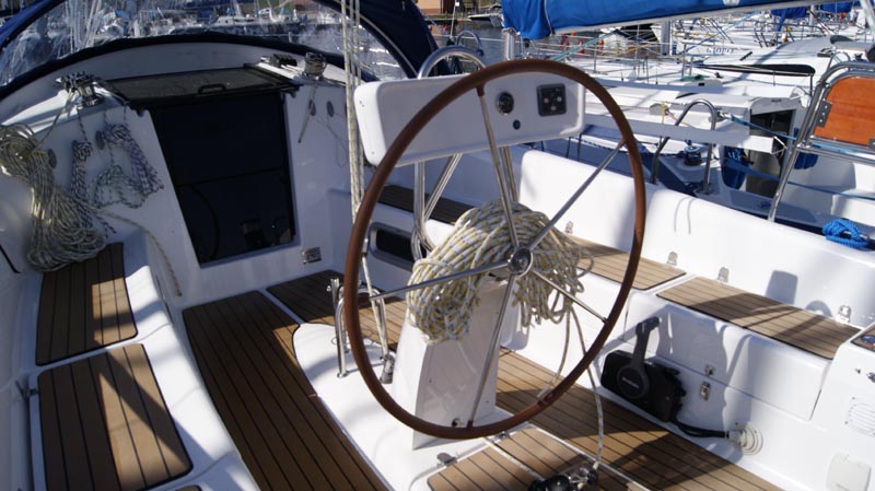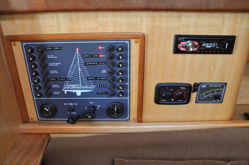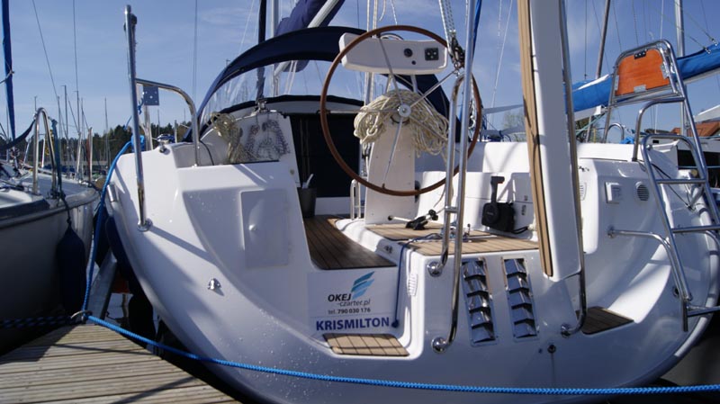 Wyposażenie dodatkowe: bramka do kladzenia masztu, sztywny sztag, roll fok, lazzy jack, bimini, instalacja wody - zbiornik, instalacja wody zaburtowej, ciepła woda, prysznic, prysznic w kokpicie, radio, CD, mp3, TV, DVD, lodówka, ogrzewanie, instalacja 230 V, ster strumieniowy, echosonda, lo