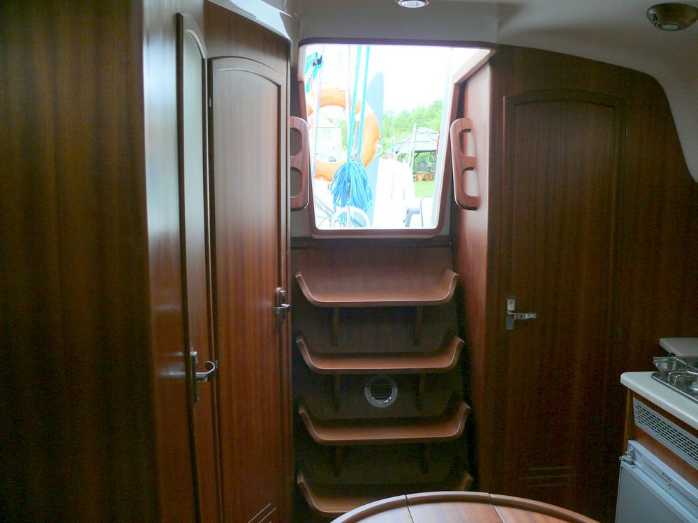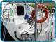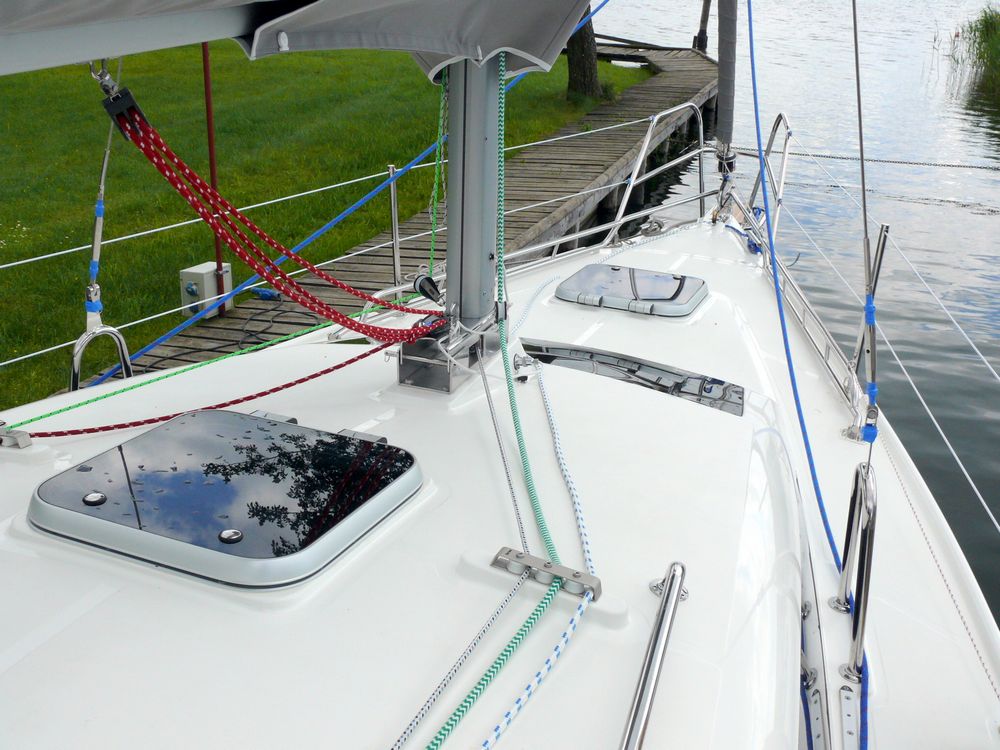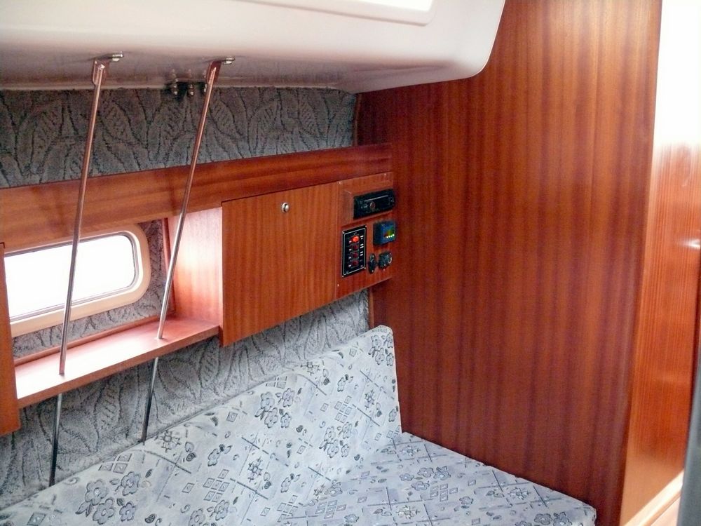 Wyposażenie dodatkowe: bramka do kladzenia masztu, sztywny sztag, roll fok, lazzy jack, instalacja wody - zbiornik, instalacja wody zaburtowej, radio, CD, mp3, TV, DVD, lodówka, ogrzewanie, instalacja 230 V, oświetlenie kokpitu, ster strumieniowy, echosonda